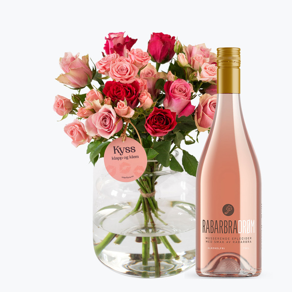Rosebuketten spesielt designet for å si: Jeg er glad i deg! Overrask din utvalgte eller en du er glad i, og send Rosedrøm levert på døren. Buketten blir levert med en flaske sprudlende Cider med smak av rabarbra + en søt tag der det står "kyss, klapp & klem". Vasen følger ikke med.
